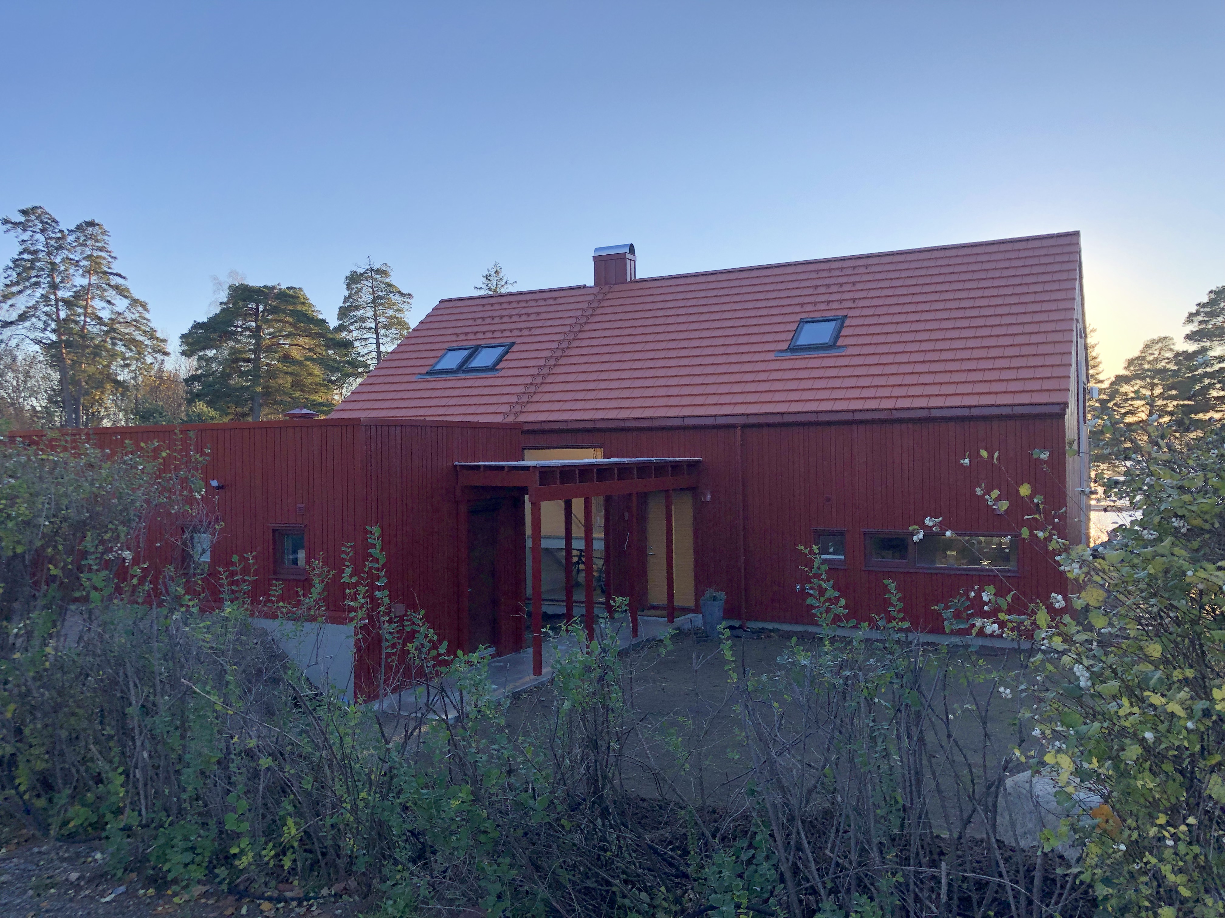 Det lå et rødmalt skjevrøstet svalgangshus med et lite uthus på eiendommen. Vår oppdragsgiver ønsket et nytt hus med rom for sin store familie. Vi har gjenskapt og bevart det gamle husets karakteristiske volum og profil. Huset er plassert på omtrent samme sted som før, men tilpasset slik at det dannes uterom for ulike behov. Svalgangen er omdannet til mindre lukkede rom som står i kontrast til større åpne oppholdsrom. Innenfor stramme rammer horisontalt og vertikalt er det skapt et vekslende spill mellom åpne og lukkede rom. Annekset er knyttet til huset med to søyleganger og danner et atrium med tuntre. Adkomsten er en linje som trapper seg ned til atriet og hovedinngangen, gjennom huset og videre ut i haven som heller ned til stranda. Terrassen er trukket inn i huset og innrammet av en pergola. Gangen på tvers knytter rommene sammen på begge etasjer. Det er åpent mellom spisestuen nede og mesaninen over. Soverommet og badet oppe er privat og har en eksklusiv utsikt over sjøen. Det er kontakt mellom ute og inne alle steder, og en god flyt i bevegelsen mellom oppholdsrommene. Utvendig er hele huset kledd med stående panel og gitt en presis detaljering. Alle flater og elementer har nyanser av rødt som samler og demper det helhetlige uttrykket.